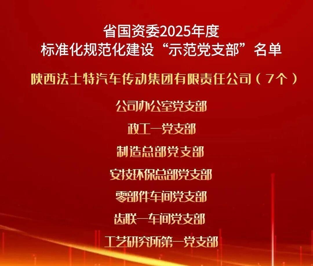 點擊量:482近日,陜西省國資委黨委通報2025年度標準化規范化建設示范黨支部名單,法士特集團公司辦公室、政工一、制造總部等7個基層黨支部榜上有名,榮獲省國資委“示范黨支部”稱號。這既是對法士特集團黨委深耕黨建品牌建設、推進基層黨組織標準化規范化建設成果的高度肯定,更彰顯了企業以制度落實強化組織效能、推進黨建與業務深度...